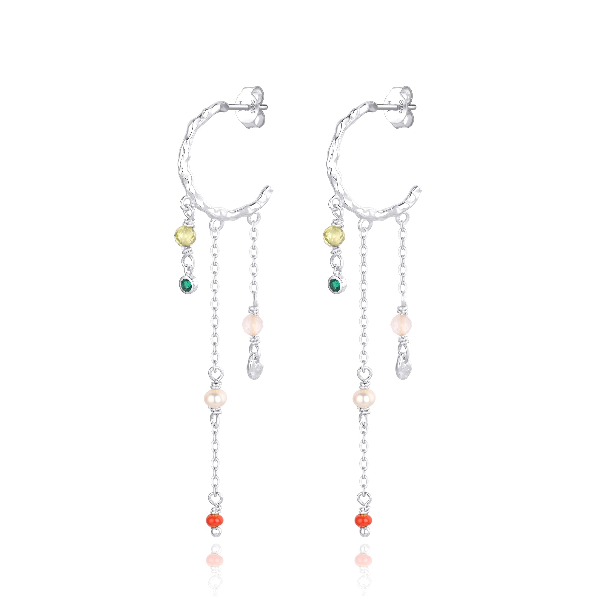 Elfrida øreringene er et par farverige og elegante øreringe i s925 sterlingsølv, pyntet med aventurin, rosa kvarts, zirkonia, enamel og ferskvandsperler.