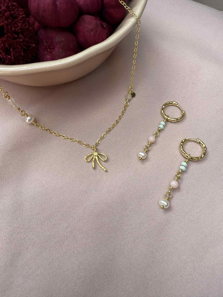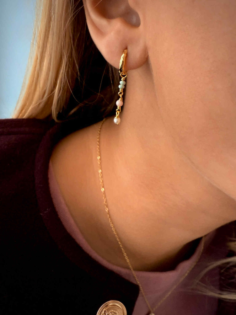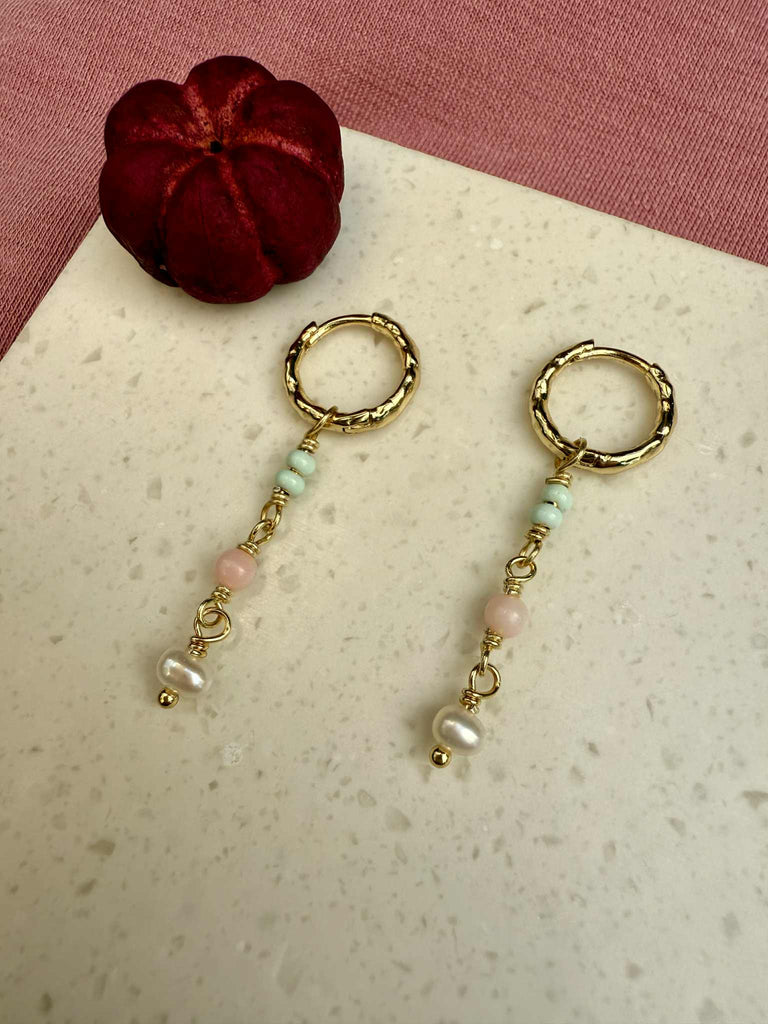 Gunhild øreringene er et par elegante og feminine øreringe i 14 karat guldbelagt sterlingsølv, pyntet med enamel, ferskvandsperler og koralfarvede detaljer.