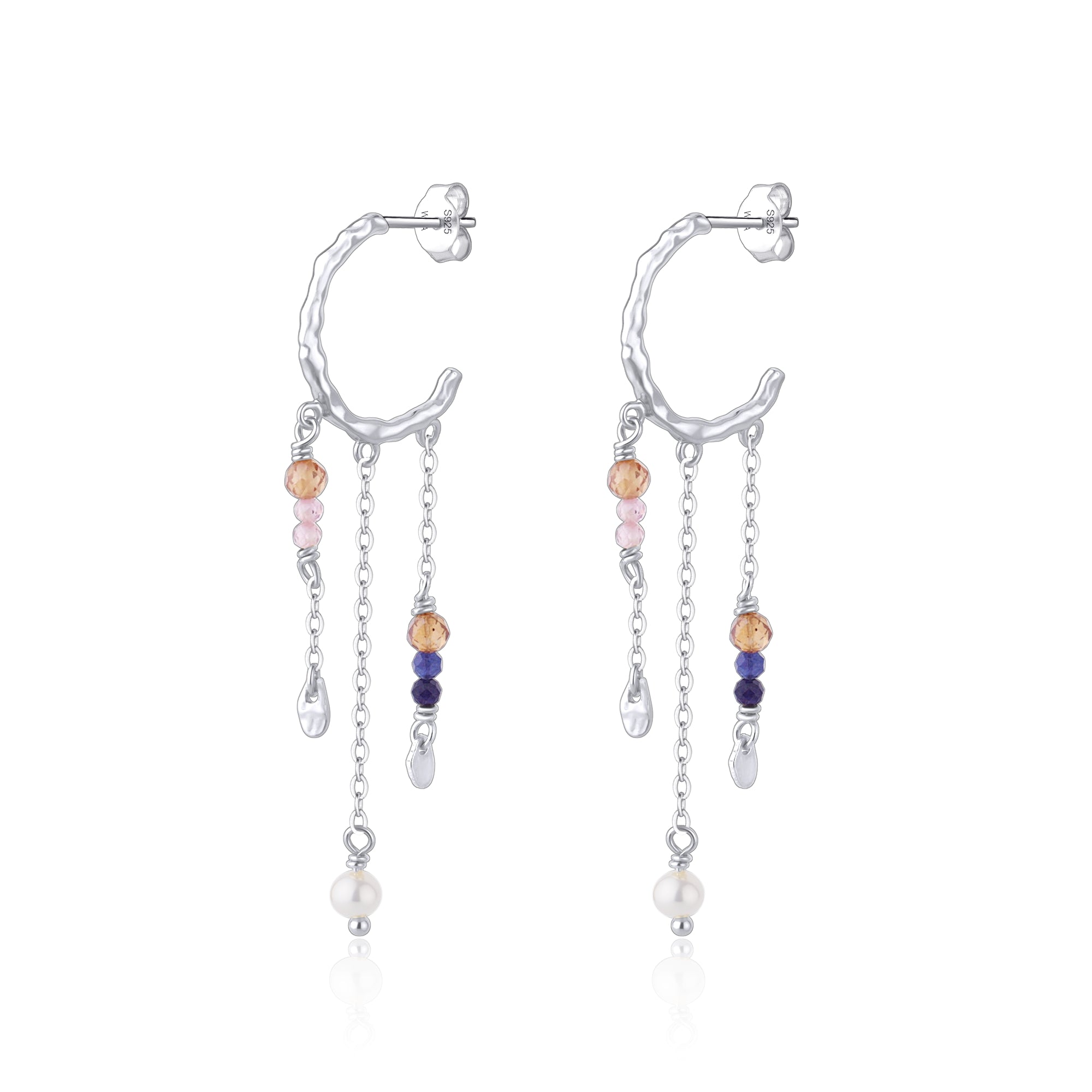 Selene øreringene er et par elegante og farverige øreringe i s925 sterlingsølv, pyntet med ferskvandsperler, rosa kvarts, citrin og turmalin. De smukke sten spiller sammen i bløde og varme nuancer, der giver et harmonisk og legende udtryk.