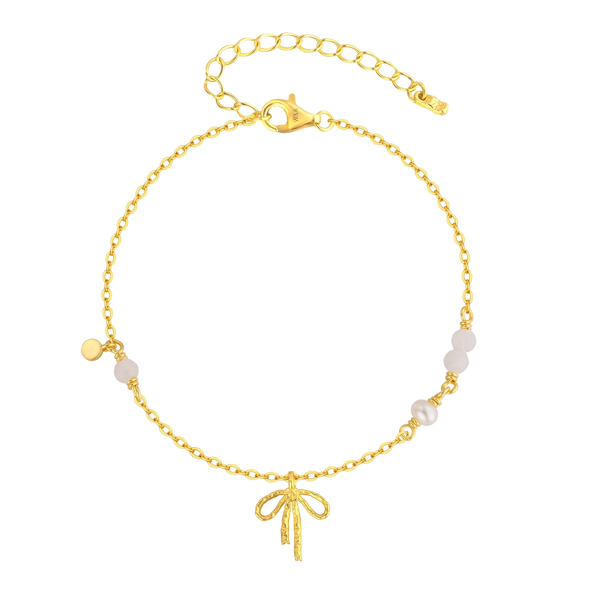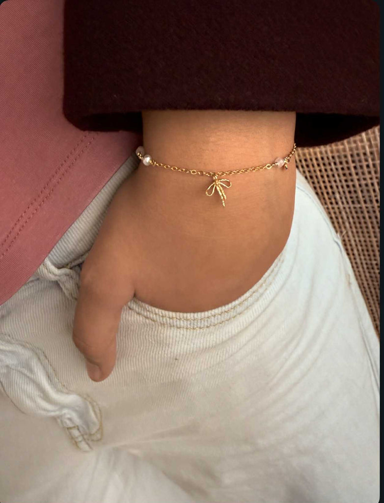Estrid armbåndet er et feminint og elegant armbånd i 14 karat guldbelagt sterlingsølv, pyntet med rosakvarts, ferskvandsperler og et smukt sløjfevedhæng.
