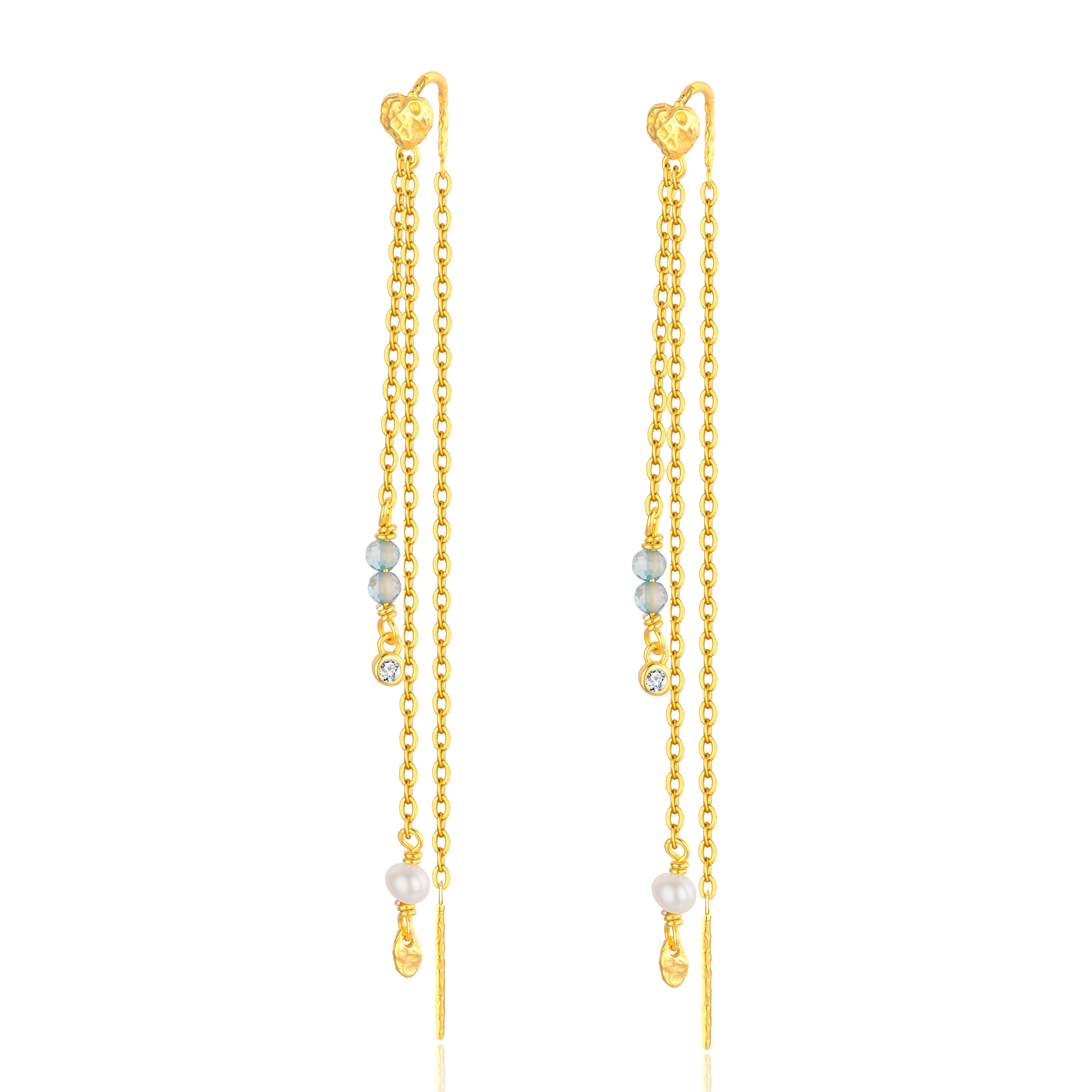 Isobel øreringene er et par elegante og feminine øreringe i 14 karat guldbelagt sterlingsølv, pyntet med blå zirkonia, ferskvandsperler og et lille hjertevedhæng.
