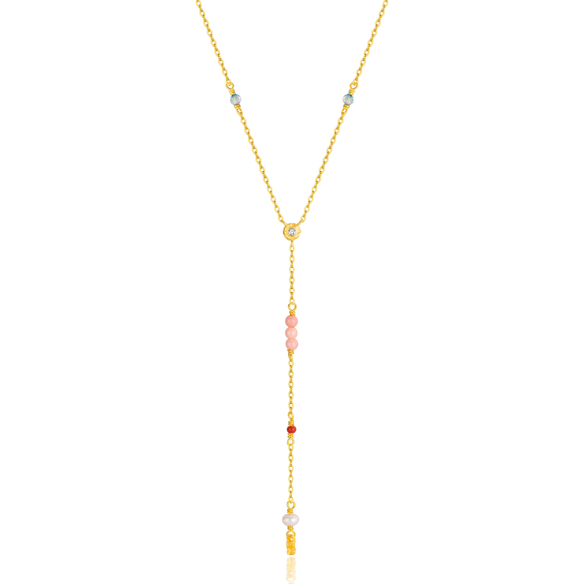 Magdalene halskæden er en elegant Y-halskæde i 14 karat guldbelagt sterlingsølv, pyntet med koralperler, orange enamel, zirkonia og ferskvandsperler.