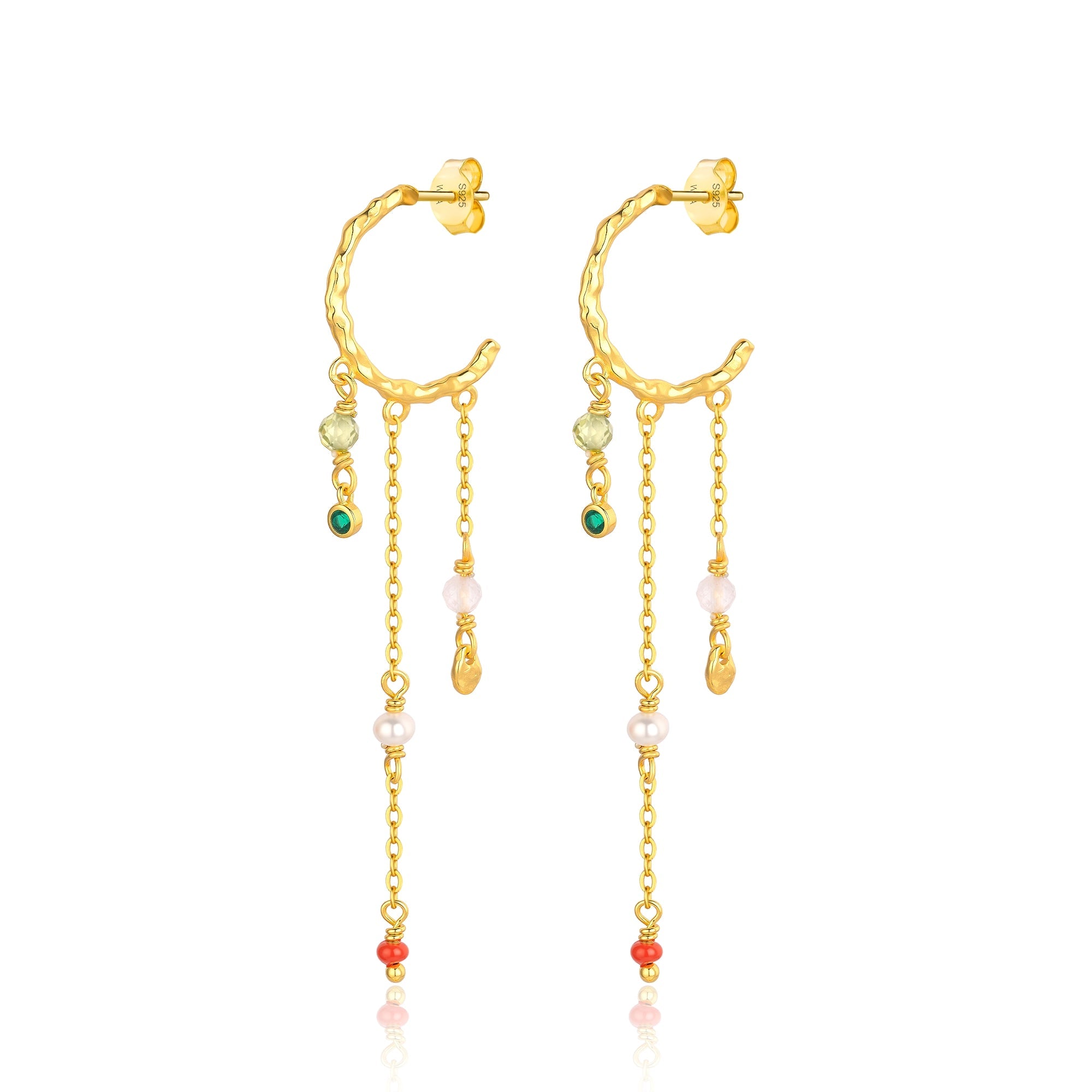 Elfrida øreringene er et par farverige og elegante øreringe i 14 karat guldbelagt sterlingsølv, pyntet med aventurin, rosa kvarts, zirkonia, enamel og ferskvandsperler.
