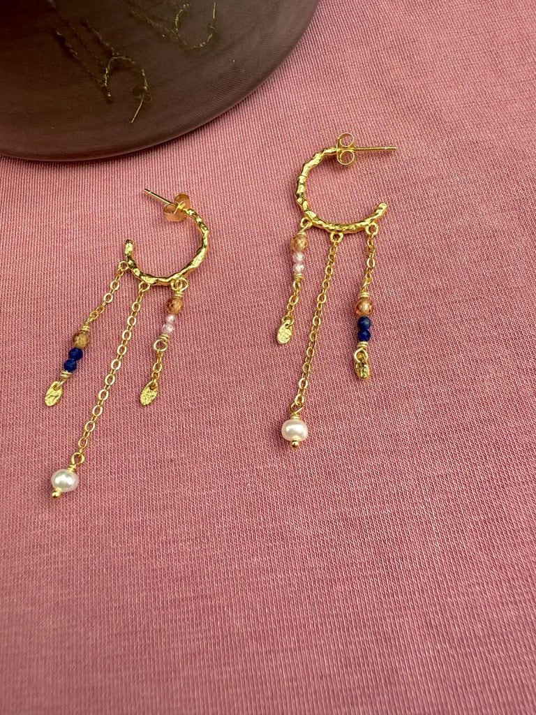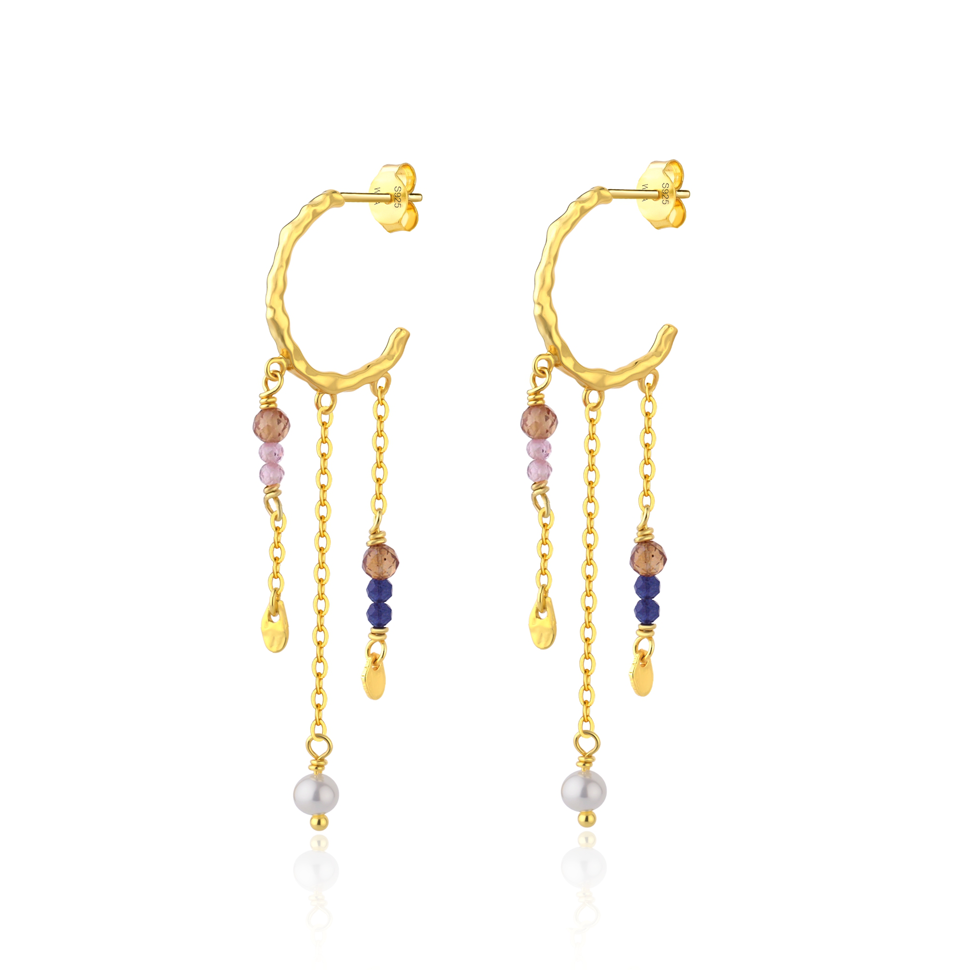 Selene øreringene er et par elegante og farverige øreringe i 14 karat guldbelagt sterlingsølv, pyntet med ferskvandsperler, rosa kvarts, citrin og turmalin.