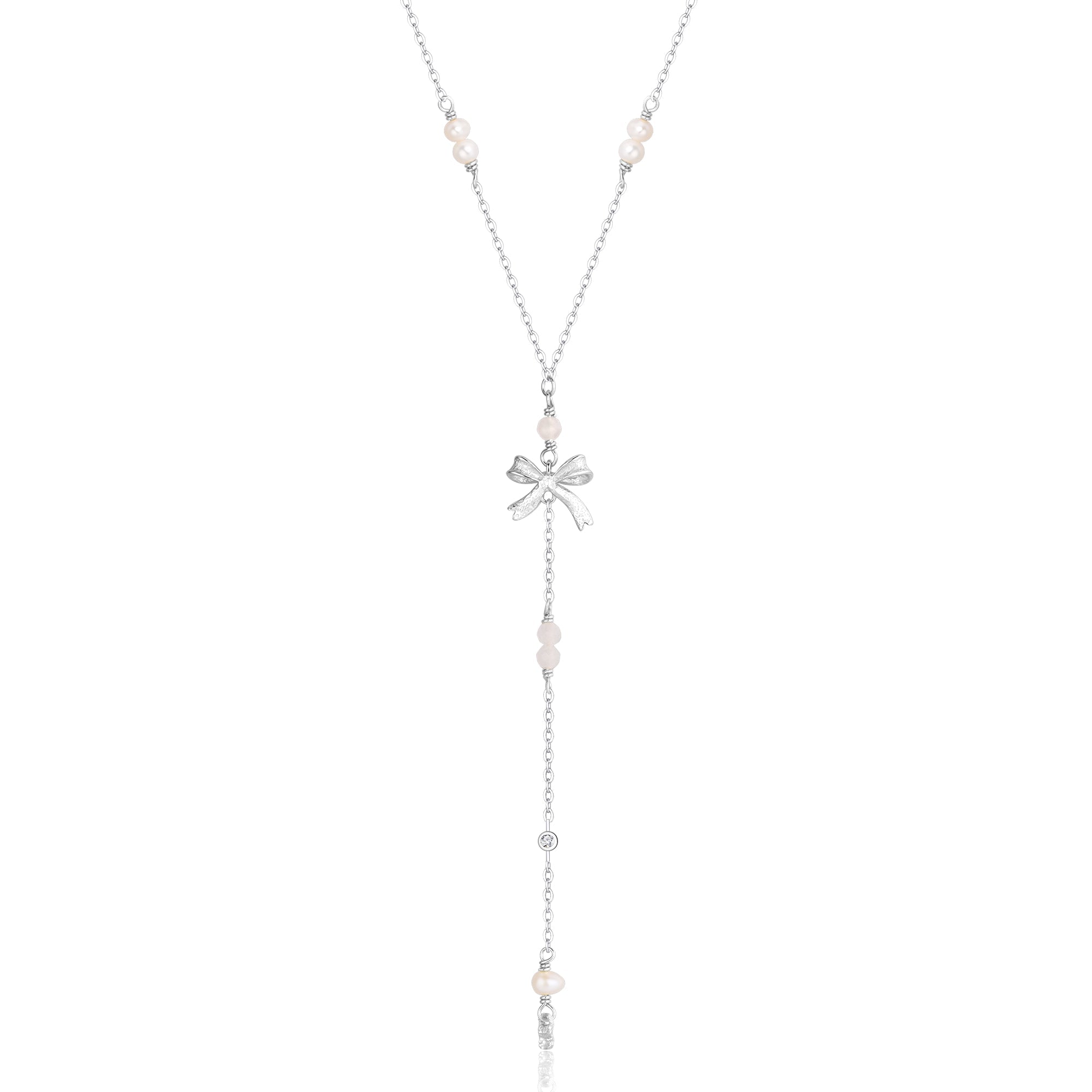 Svala halskæden er en elegant og feminin Y-halskæde i sterlingsølv, pyntet med rosakvarts, ferskvandsperler og små zirkonia sten. Den fine sløjfe-detalje giver halskæden et romantisk og yndefuldt udtryk, mens de bløde nuancer og funklende sten tilfører et strejf af lethed og charme.