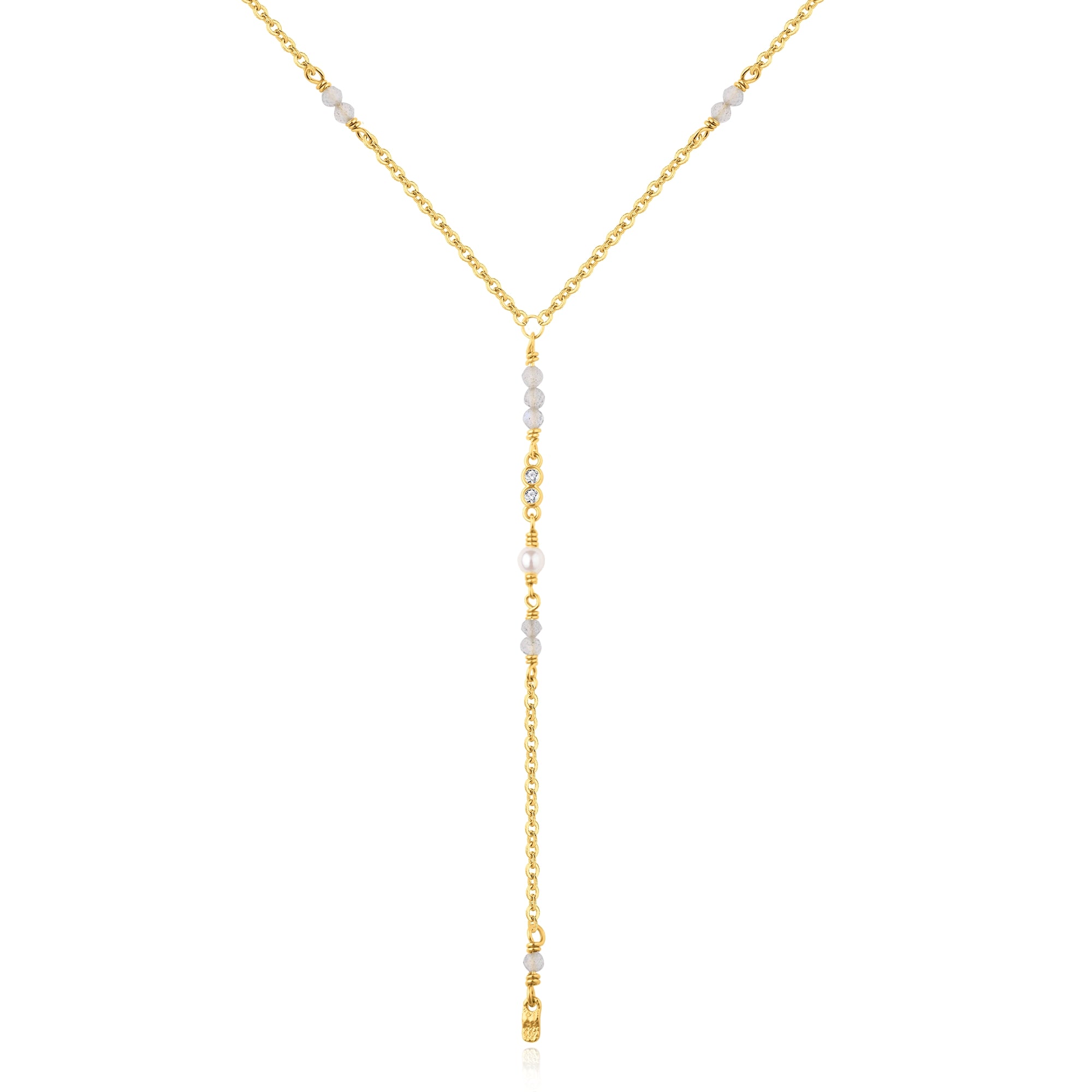 Gesa halskæden er en elegant og feminin kæde i 14 karat guldbelagt sterlingsølv med fine detaljer af månesten og små ferskvandsperler.